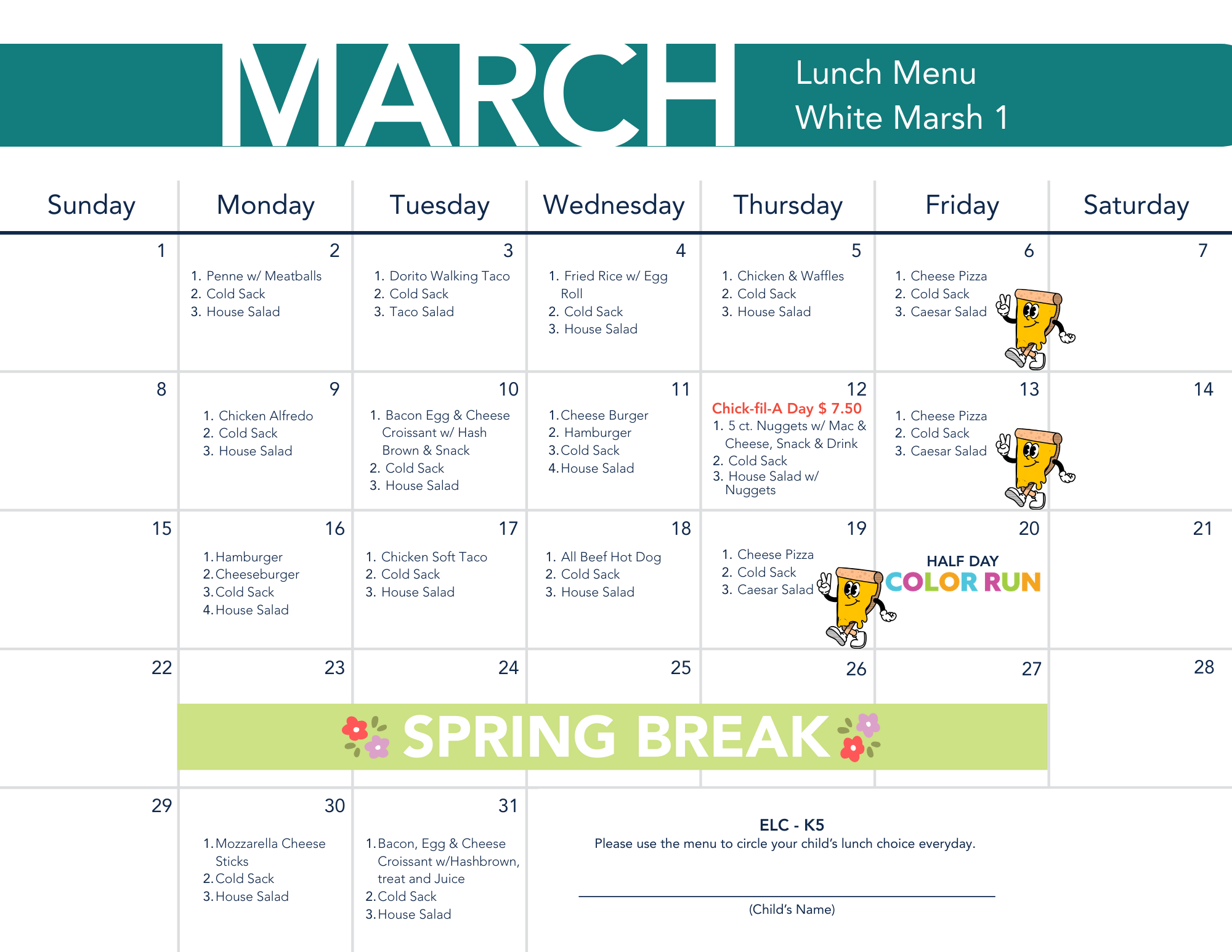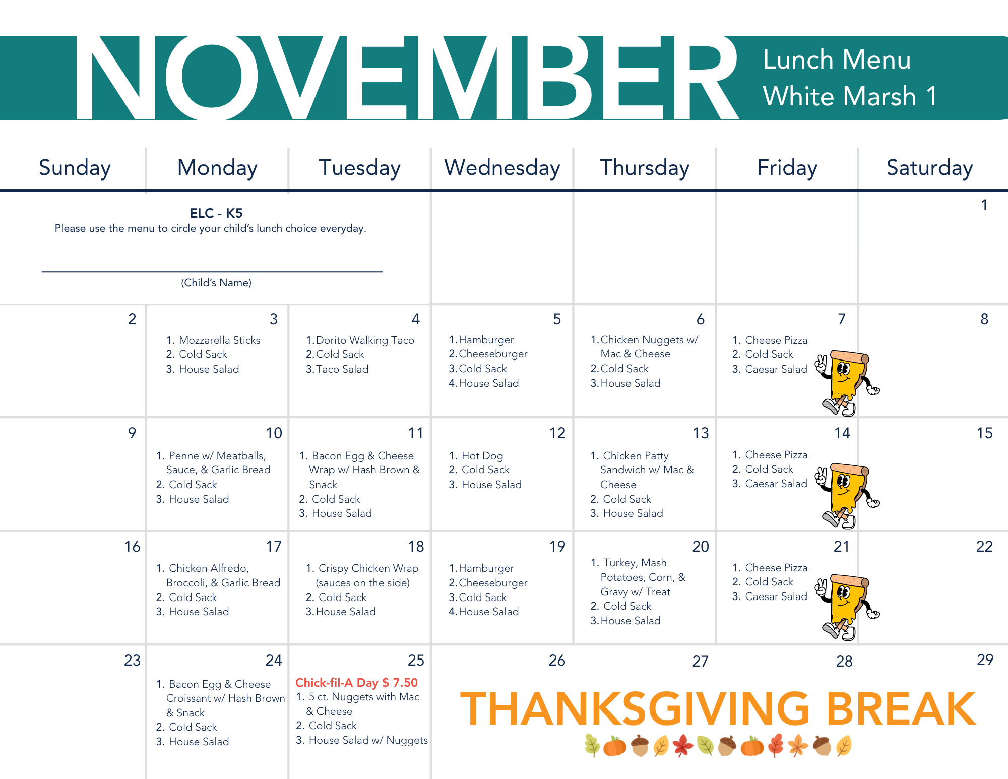 - Hot Lunch – $7 (Includes: large entree, side, fruit, and drink)