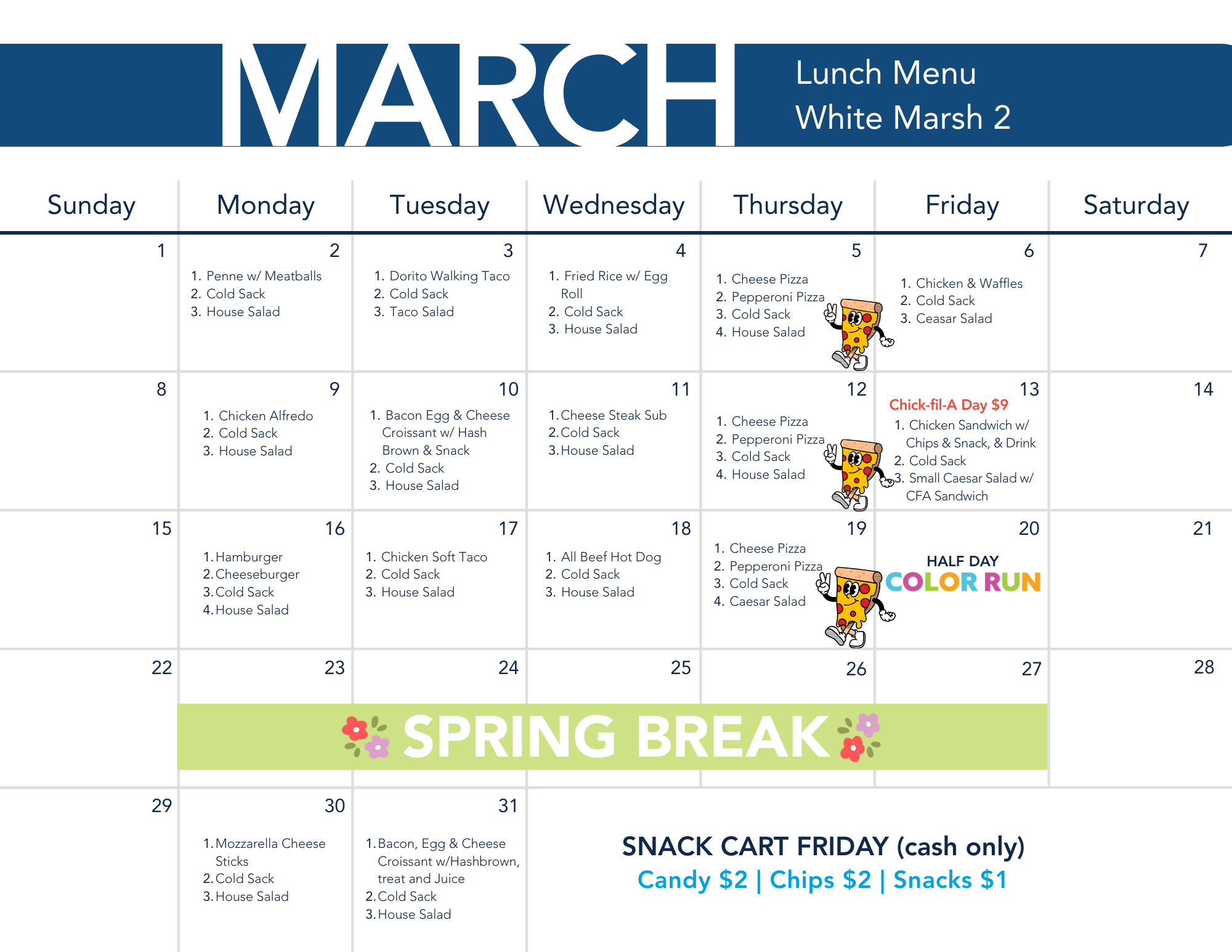 - Cold Snack – $7 (Includes: Two PBJ Uncrustable sandwiches, chips, cheese stick, fruit, and drink)